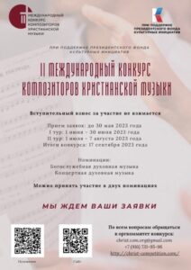 До 30 мая идет прием заявок на II Международный конкурс композиторов христианской музыки. Проект поддержан Президентским фондом культурных инициатив.